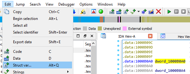 After that we go to the address of dword_1000B0A0 and press (alt + Q) or selecting Edit -> Struct var…: